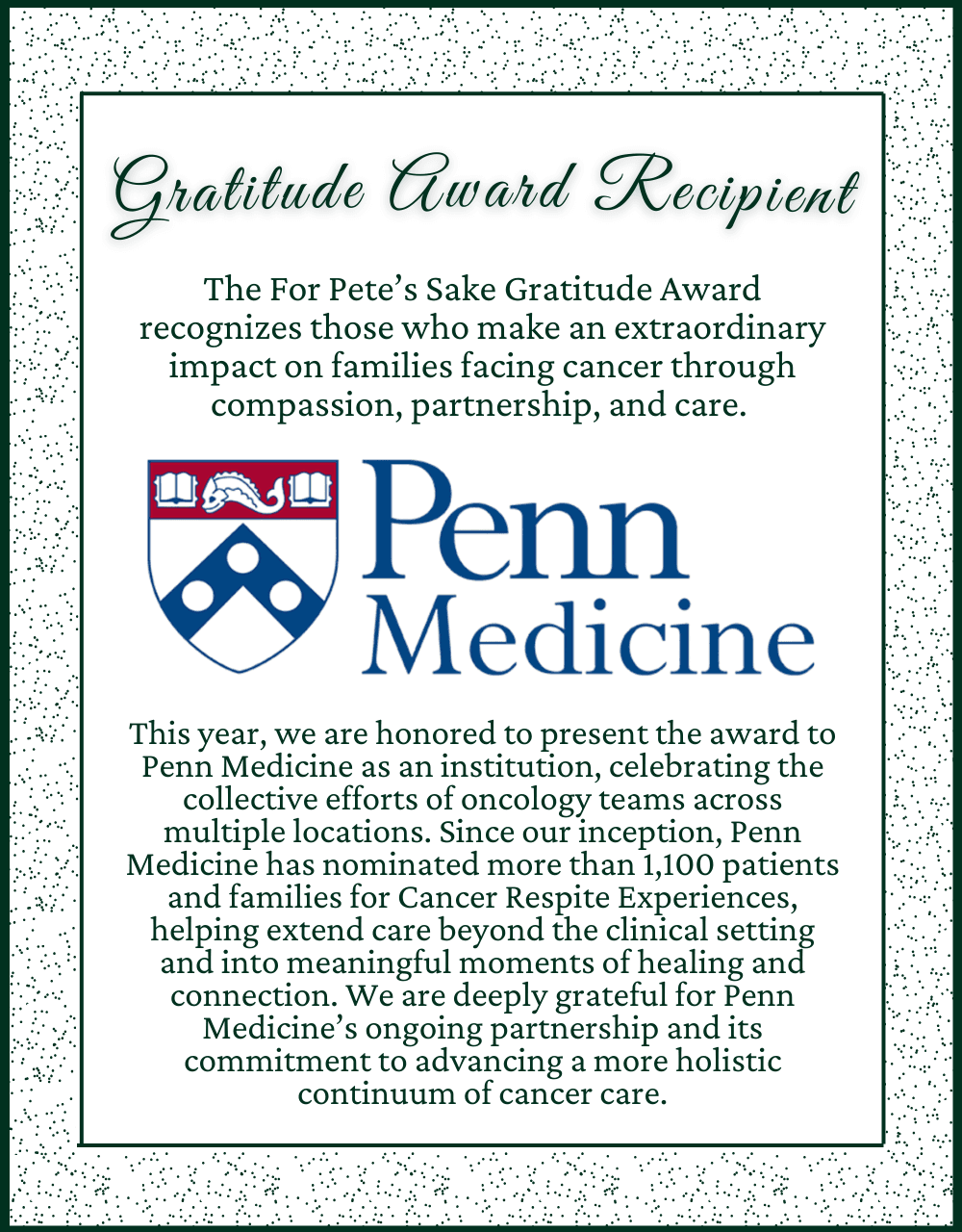 Join us for our 25th Annual For Pete’s Sake Gala, an evening dedicated to uniting our FPS Community and envisioning a future where every family battling cancer finds comfort and hope through the power of respite.